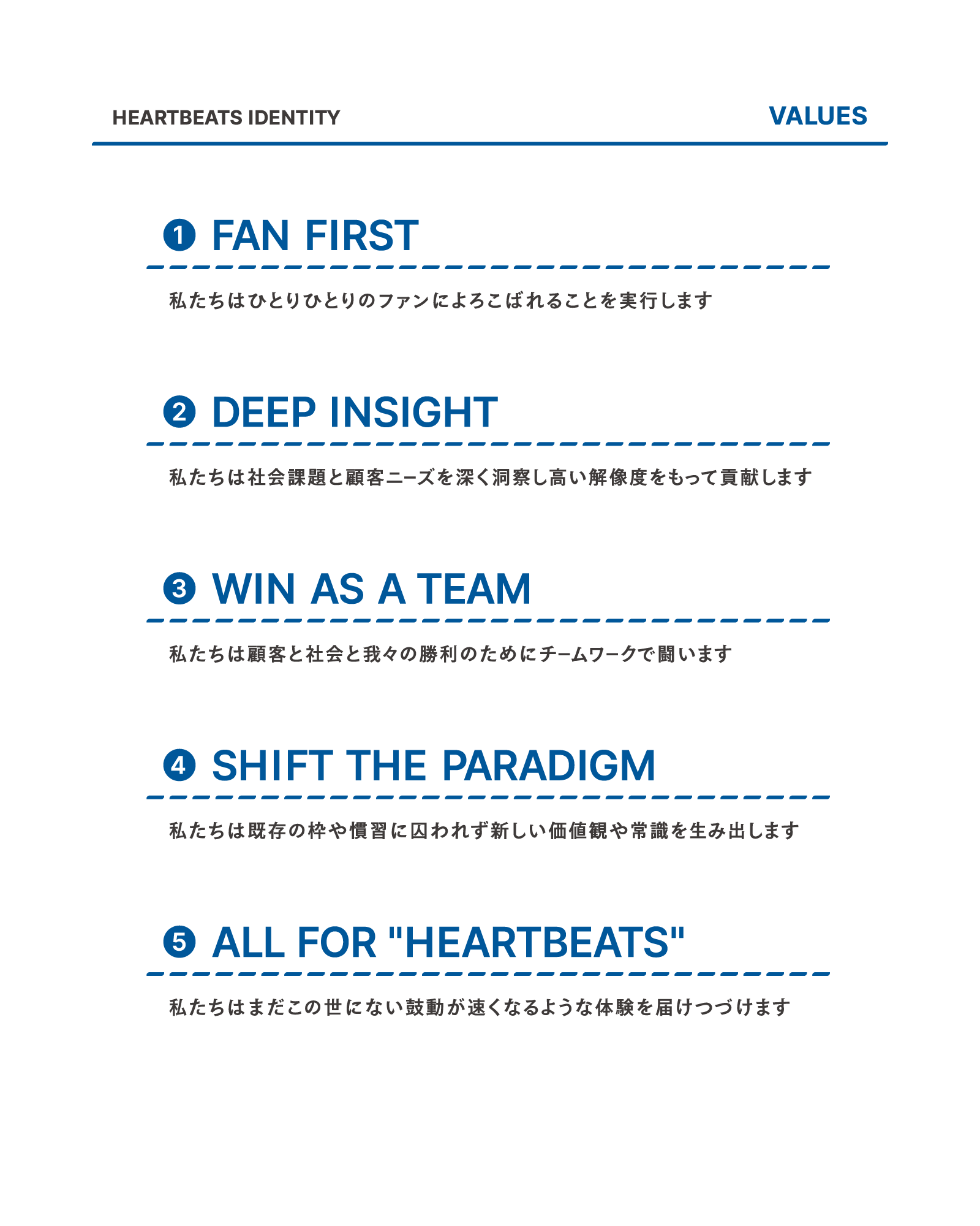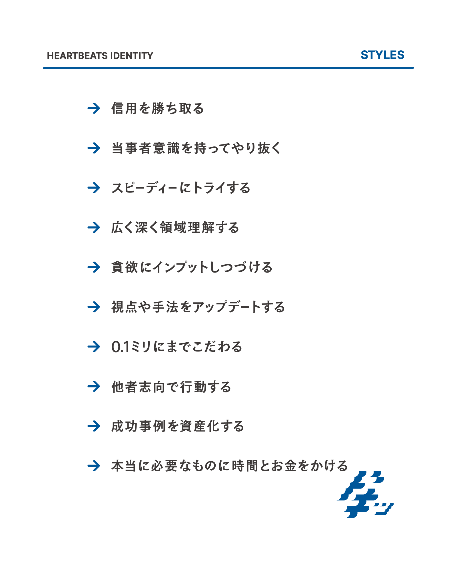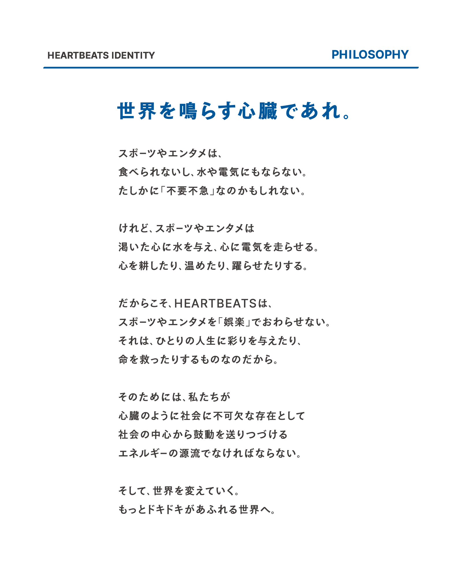 結果的には、そこから足掛け3年かけて、新社名である「HEARTBEATS(ハートビーツ)」のネーミング開発、そのロゴマーク及びV.I.開発、企業理念づくり、採用メッセージ開発、コーポレートサイト制作、インターナルセッション(社名変更にあたっての社員向けの全3回の理念浸透のためのワークショップ)の企画・実施などの担当いたしました。