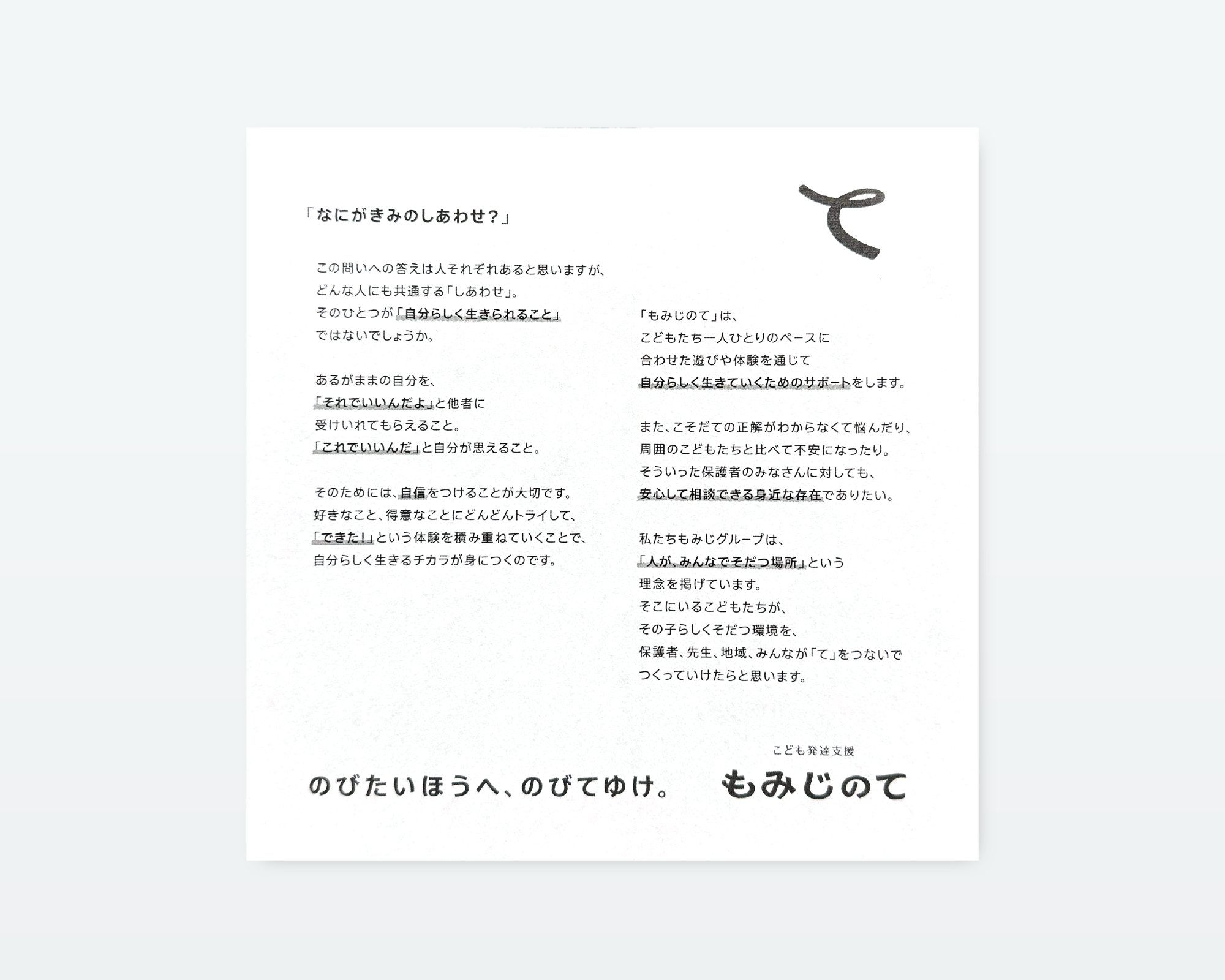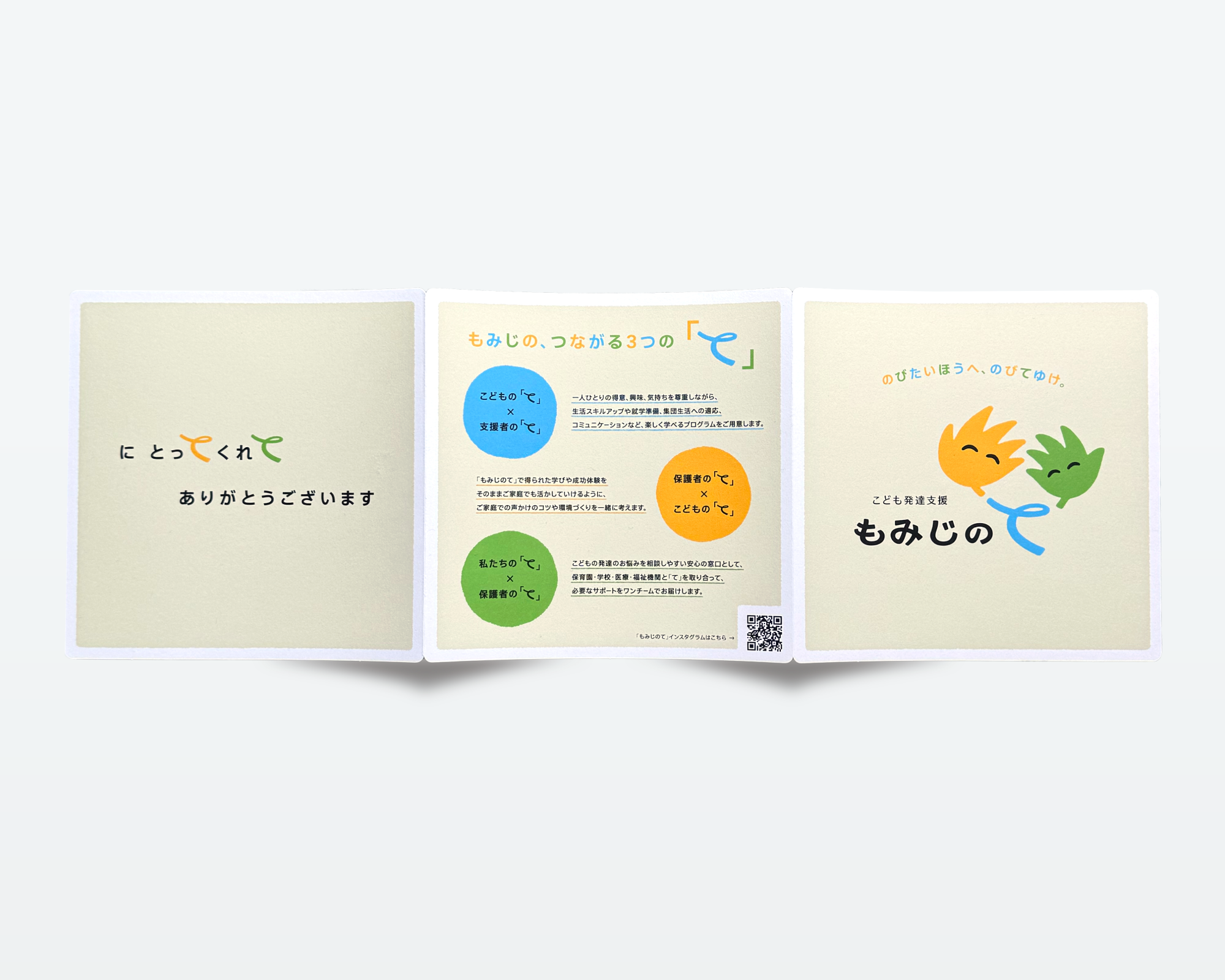 東京と福岡で50年にわたって幼児教育事業をやってこられた「福岡幼児学園」の保育園事業の母体である「信正会」が、2025年秋から児童発達支援所を新たにスタートされるということで、その施設のネーミング、ブランドステートメント、パンフレットづくりを担当いたしました。日本におけるこどもの発達障害などの問題を広く深く捉えた経営者の方の志に触れて、これからの時代にいかに多様なこどもたちの教育の居場所やあり方、保護者の方へのサポート環境などが大事であるかを学ぶことができました。今回はもともと東京を中心に展開されている「もみじ保育園」との連携の施設ということで、地域のみなさんに親しまれている「もみじ」の名称はそのまま使用して、そこに2文字「のて」(の手」)をプラスして、もみじブランドの信頼感とこのブランドが目指していく世界観を表現しました。ロゴのイラストは長年この「もみじ」さんでイラストを描いてくださっているながしまひろみさん、ロゴデザインとアートディクションは森智明さんです。ロゴマークは、もみじにも見えるし、手にも見えるキャラクター。ここから羽ばたいていくこどもたちへの願いを「て」の部分で『風』を表現しています。また、お問い合わせをいただいた保護者の方にお渡しするパンフレットには、オリジナルの折り紙付き(裏面にはステートメントを掲載)。親子で一緒に遊んでもらえたらという考えのもとオマケをつくりました。